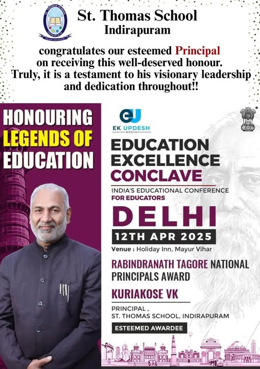 A Moment of Pride! St. Thomas School, Indirapuram proudly congratulates our esteemed Principal, Mr. Kuriakose VK, on receiving the prestigious Rabindranath Tagore National Principals Award at the Education Excellence Conclave 2025, held on 12th April 2025 at Holiday Inn, Mayur Vihar, Delhi. This recognition is a true testament to his visionary leadership, unwavering dedication, and outstanding contribution to the field of education. Honoured under the theme “Legends of Education,” the award highlights his commitment to nurturing excellence and inspiring generations of learners. We, at St. Thomas School, celebrate this proud achievement and extend our heartfelt wishes to our Principal for many more milestones ahead! "Leadership is not about titles, positions, or flowcharts. It is about one life influencing another."